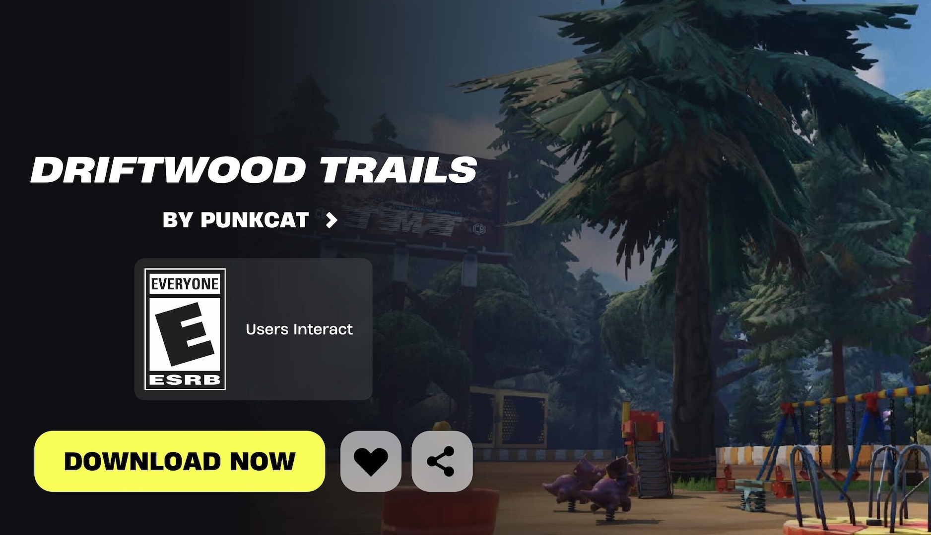 Punkcat : Driftwood Trails is an exhilarating Rocket Racing map crafted within UEFN (Unreal Editor for Fortnite). Up to 12 players can compete, racing through winding turns and stunning forest scenery to complete three laps.